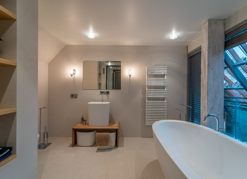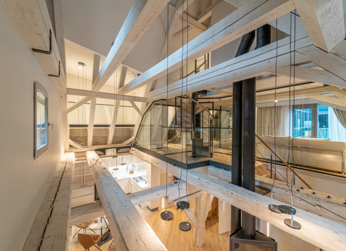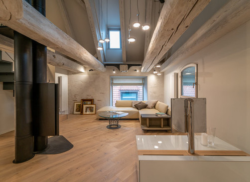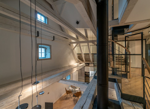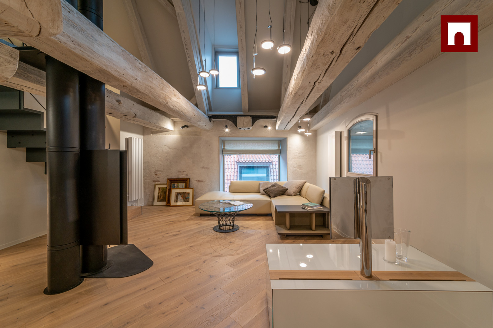 + Spacious studio living room with a natural wood fireplace and views of the roofs of Old Riga and church choirs