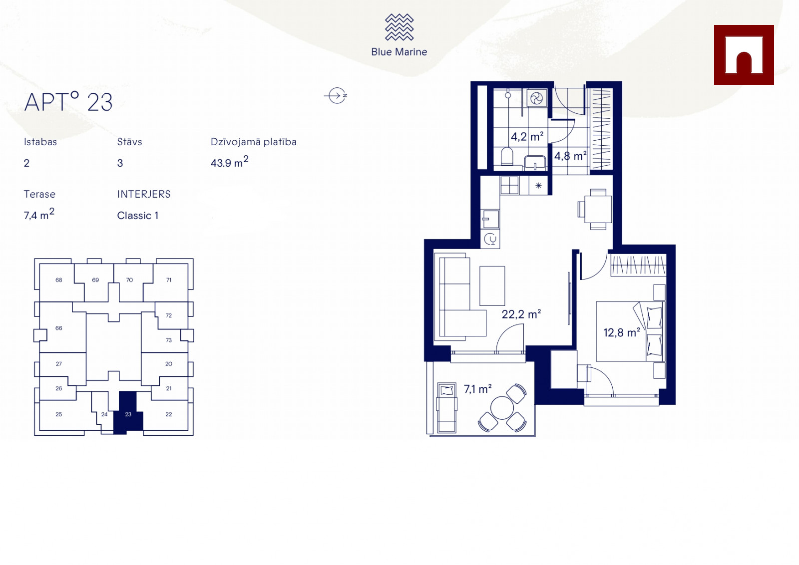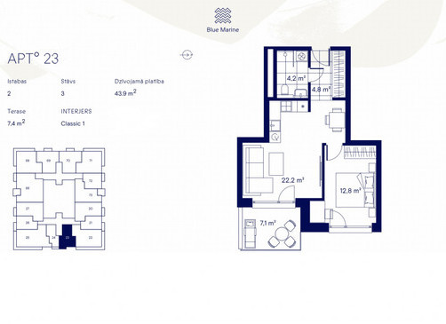 Blue Marine is the next residential building in the Klīversala quarter, which is being developed into a single living environment, which harmoniously combines historical character, modern architecture and a well-thought-out landscape of the territory. The project’s location in a place surrounded by nature, right on the shore of the Daugava Agenskalns Bay and near the park, will create a special peaceful everyday feeling.