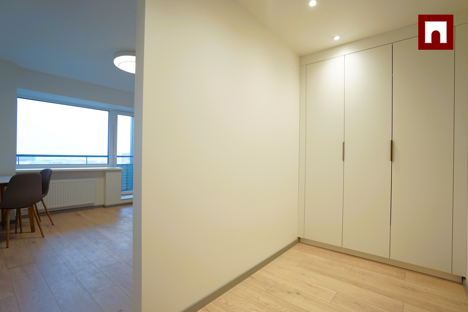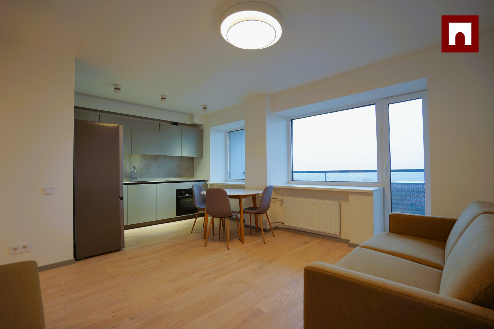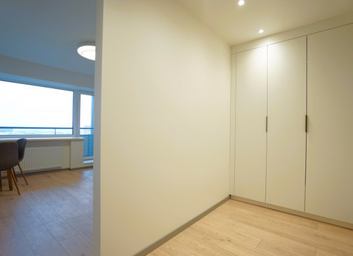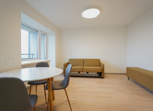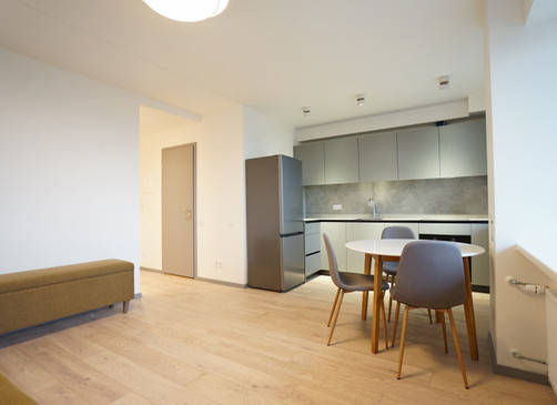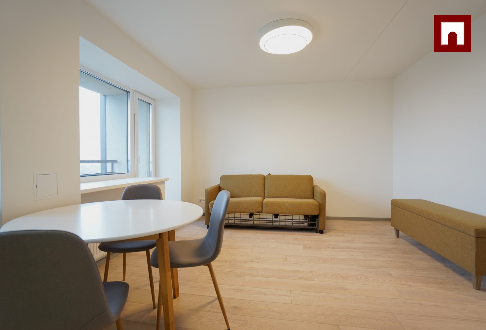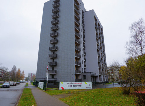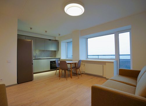 A modern, compact 1-room studio apartment is offered for rent in a renovated building at Aviācijas iela 2 E.