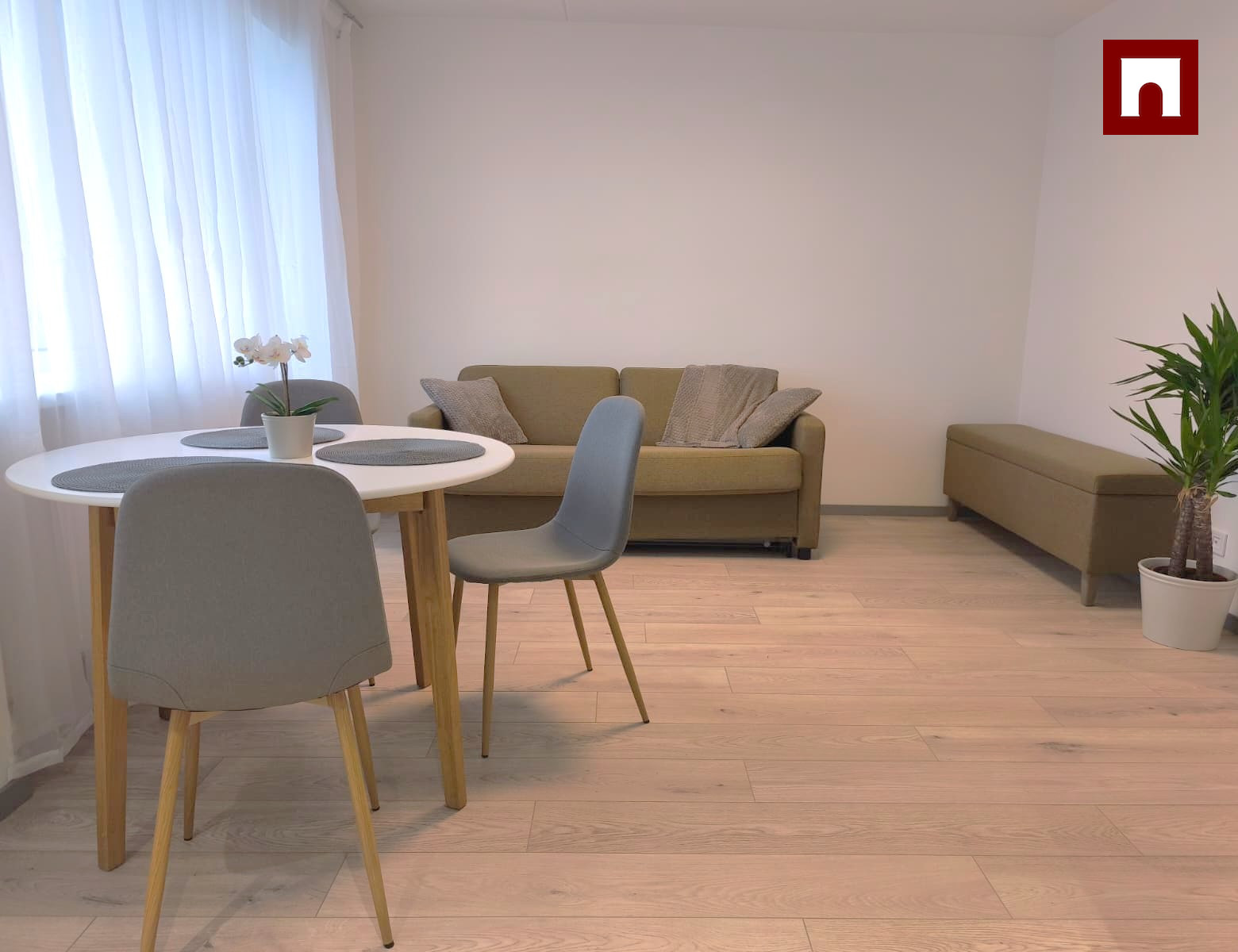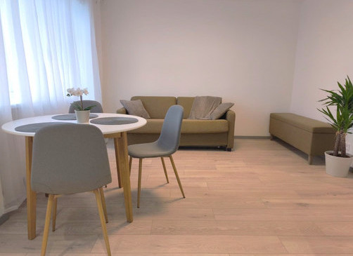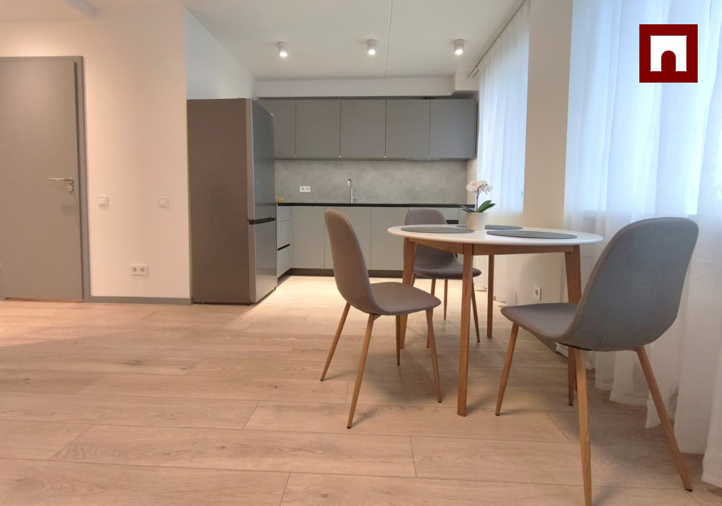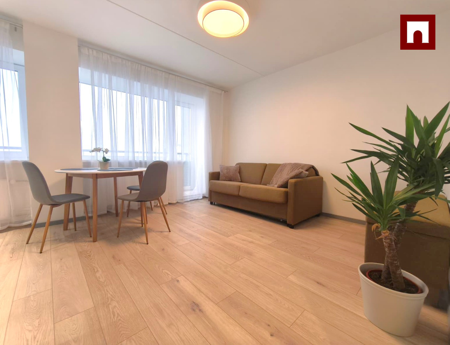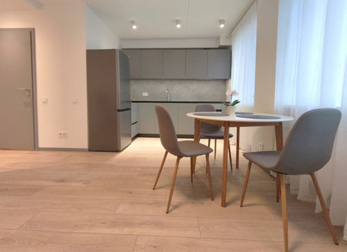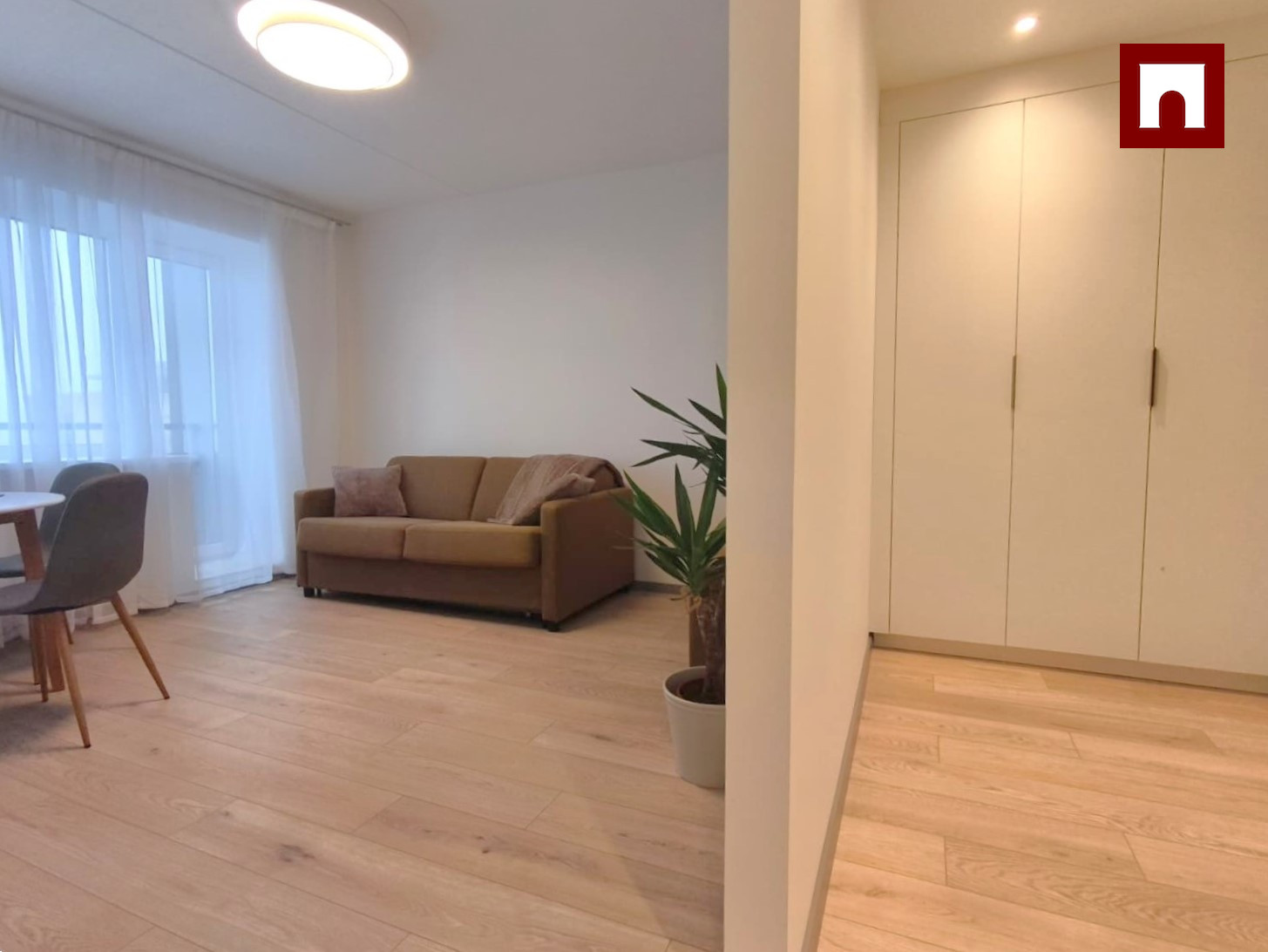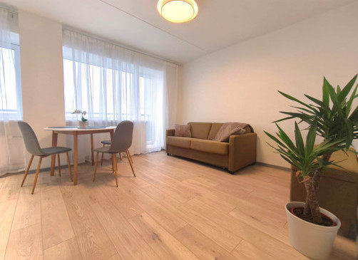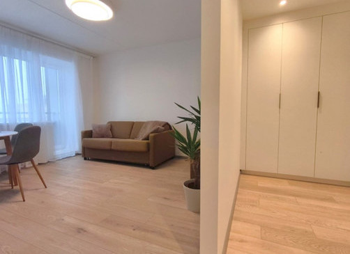 A modern, compact 1-room studio apartment is offered for rent in a renovated building at Aviācijas iela 2 E.