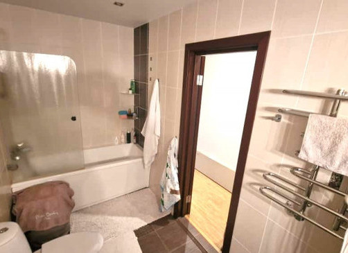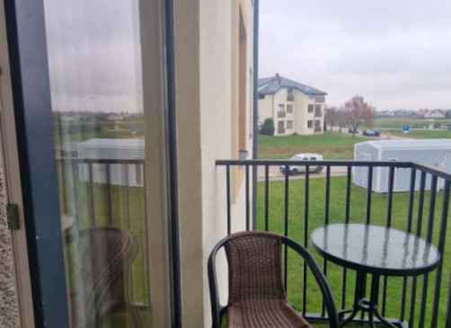 The interior is bright and thoughtfully designed — a living room combined with a kitchen, two separate bedrooms, a bathroom with a bathtub, an additional guest WC, and a spacious terrace.