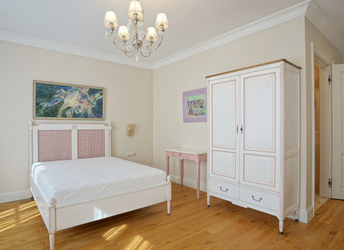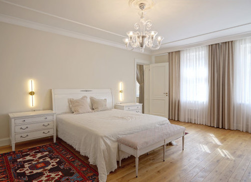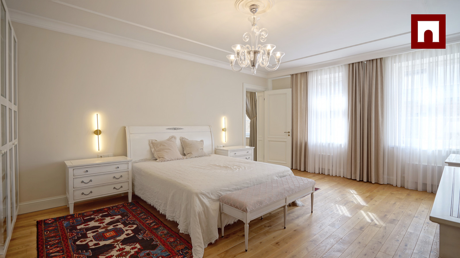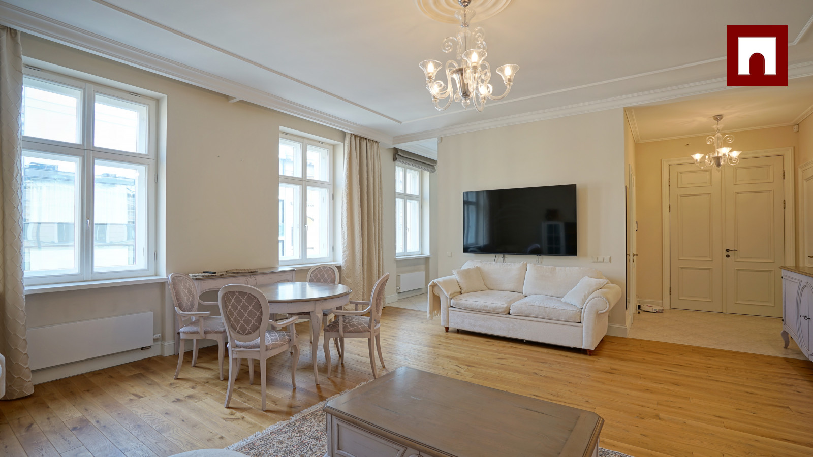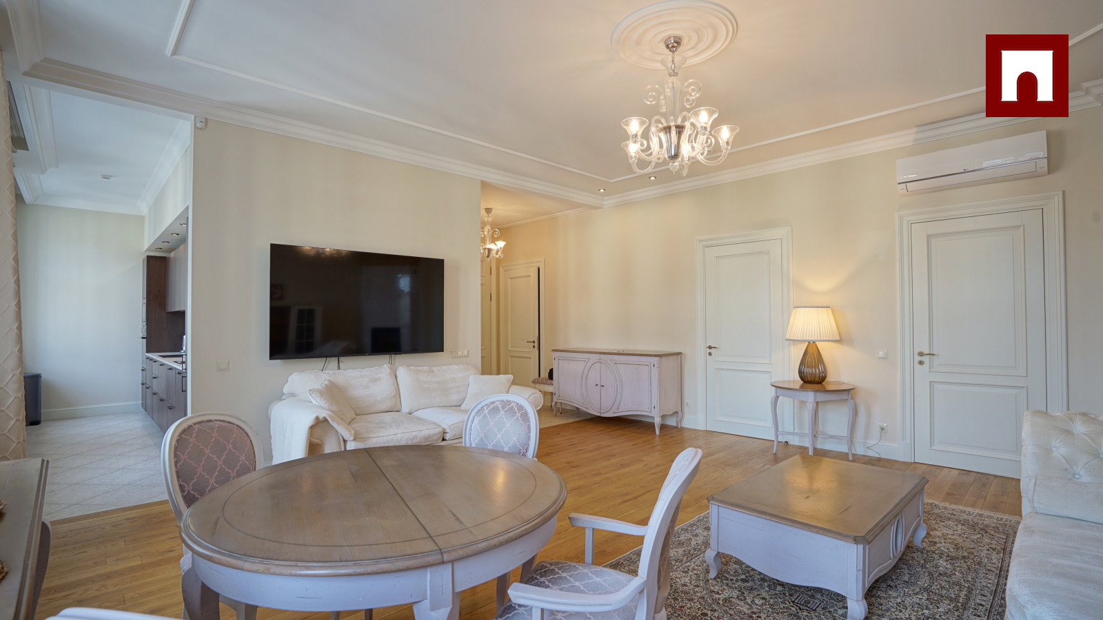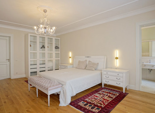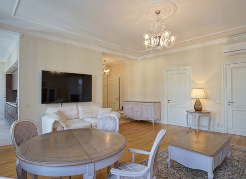 Spacious 3-room apartment of 123 m², completely renovated. Soft interior, high ceilings and solid wood floors create a feeling of spaciousness. The apartment has a spacious living room with a kitchen and dining area, two bedrooms (both with a private bathroom), as well as another bathroom with heated floors.