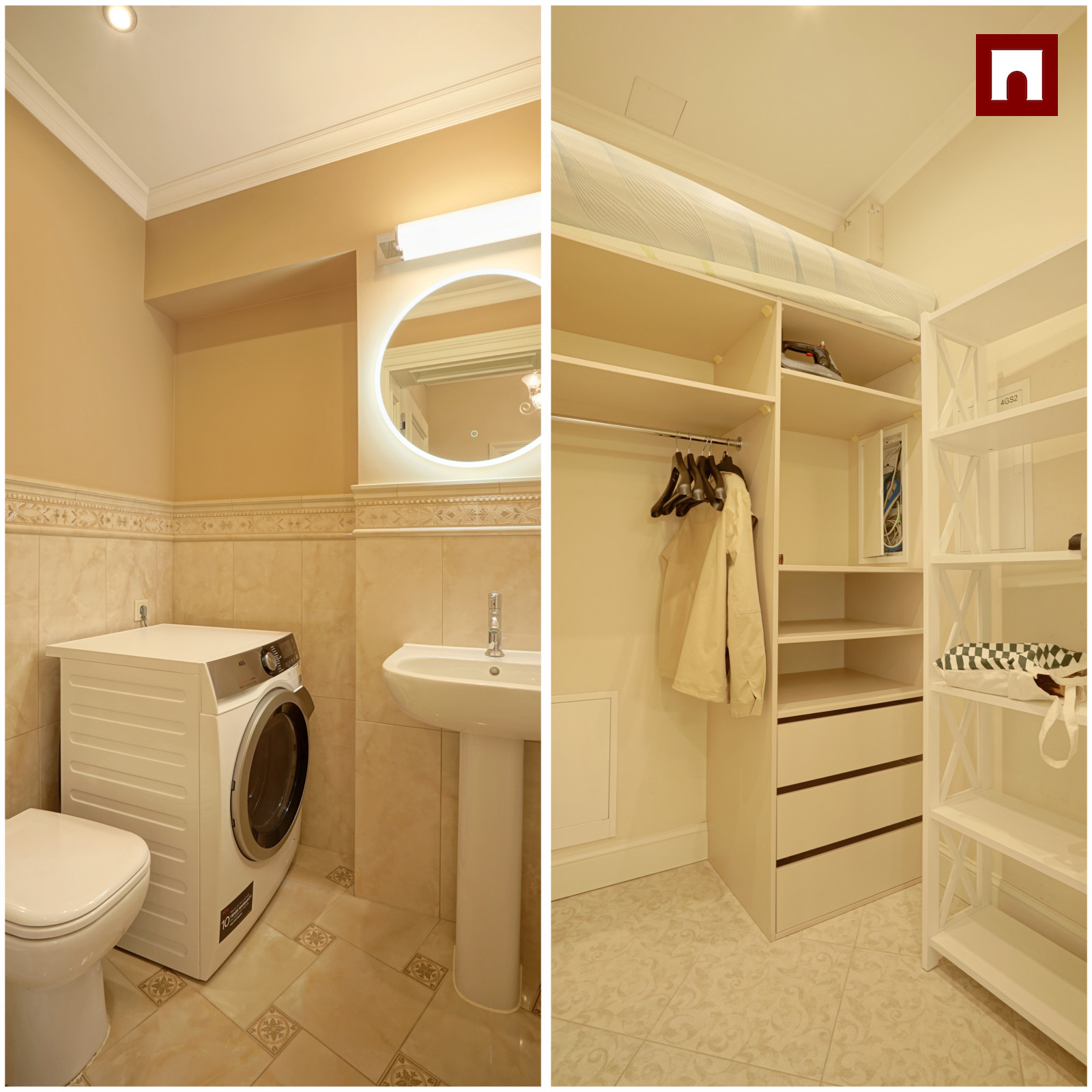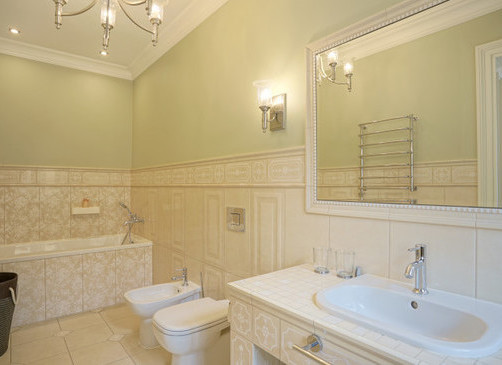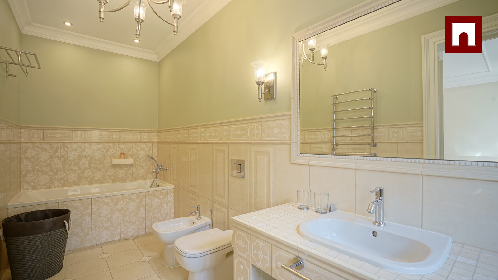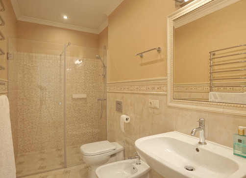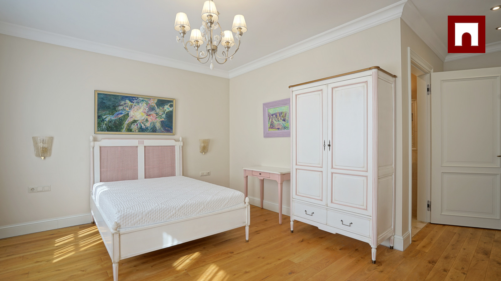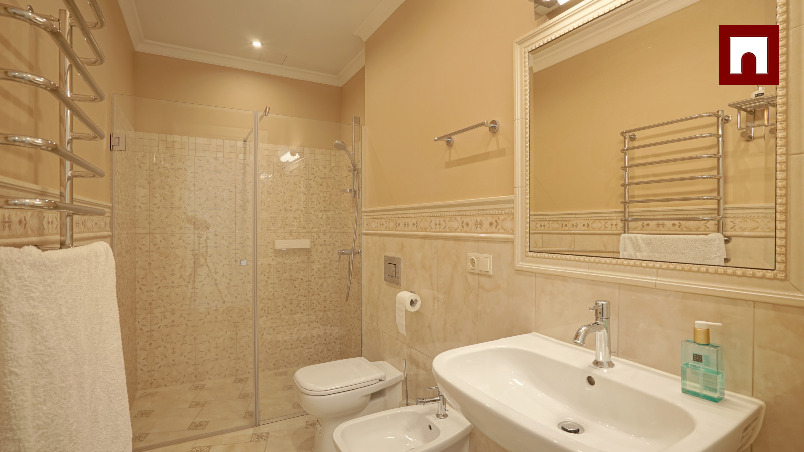 Spacious 3-room apartment of 123 m², completely renovated. Soft interior, high ceilings and solid wood floors create a feeling of spaciousness. The apartment has a spacious living room with a kitchen and dining area, two bedrooms (both with a private bathroom), as well as another bathroom with heated floors.
