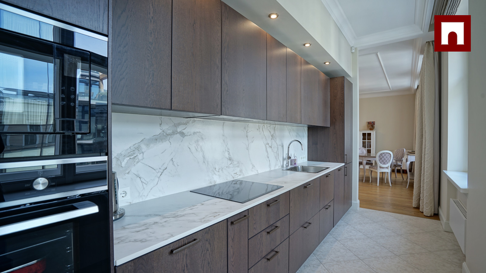 The apartment is equipped with built-in furniture, a modern kitchen, a full set of household appliances and air conditioners in all rooms. The windows overlook a quiet courtyard and Elizabetes Street.