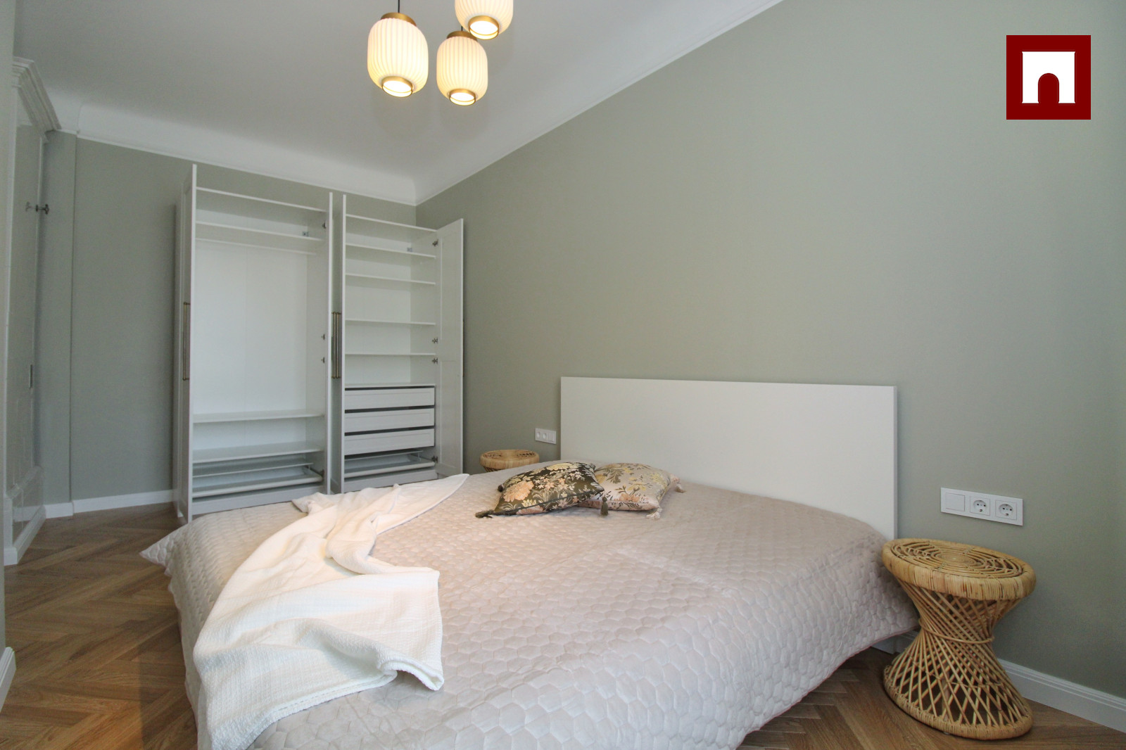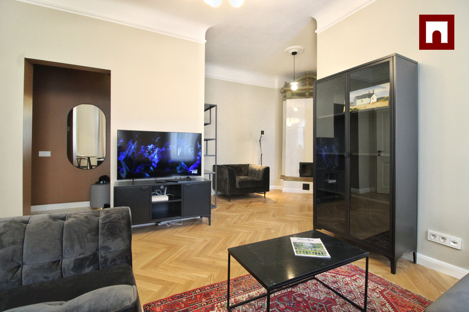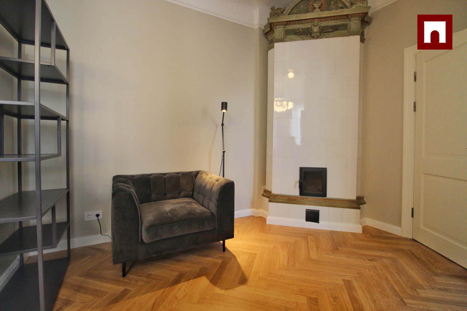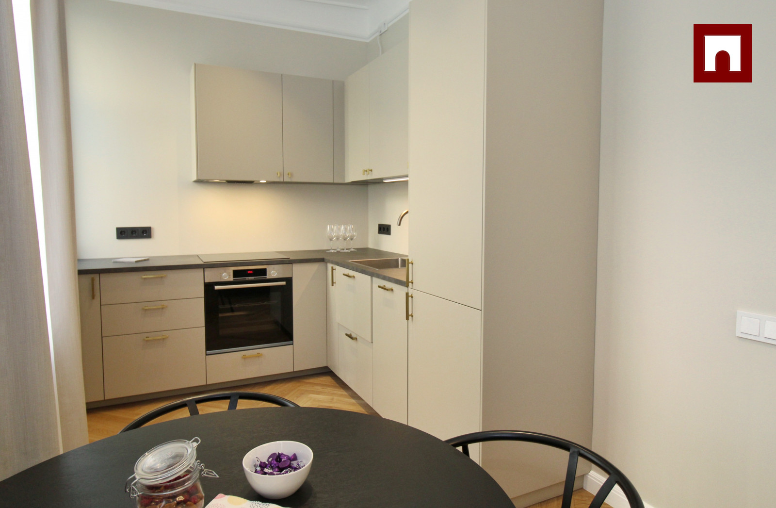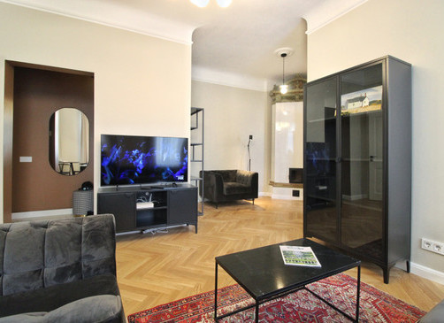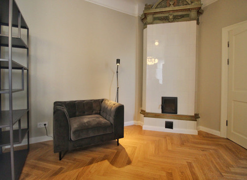 Tas sastāv no divām guļamistabām, viesistabas, kas apvienota ar virtuvi. Virtuve ir pilnībā aprīkota ar Bosch trauku mazgājamo mašīnu, cepeškrāsni, indukcijas plīti un lielu ledusskapi. Viesistabā ir jauna podiņu krāsns, ērts dīvāns un krēsli, televizors un ātrs TET optiskais internets ar televīziju. Lielajā guļamistabā ir divguļamā gulta 1,80 m platumā, plašs skapis, mazajā guļamistabā ir tikai skapis, taču šī istaba ir pielāgojama dažādām vajadzībām. Vannasistabā ir vanna, Bosch veļasmašīna ar veļas žāvētāju, santehnika no Laufen, PAA un Hansgrohe un apsildāma grīda. Dzīvoklī ir ozolkoka parketa grīdas, un logi vērsti uz pagalmu.
