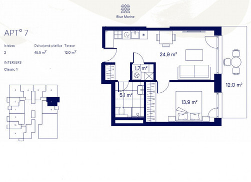 Arī daudzdzīvokļu ēkas Blue Marine interjera apdare ir izvēlēta balstoties uz sinerģiju starp dabu un pilsētu, sniedzot estētisku baudījumu un komfortablus dzīves apstākļus.