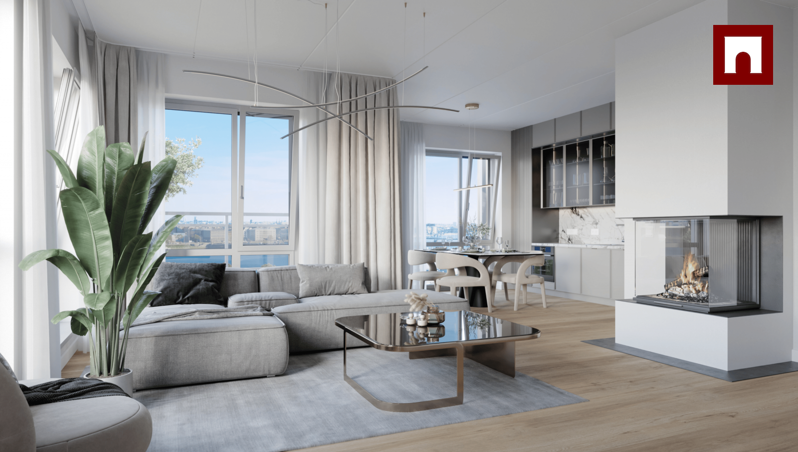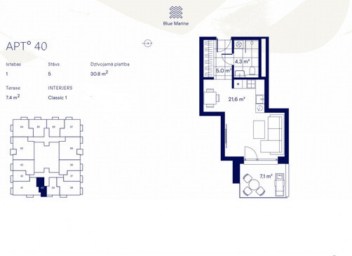 Arī daudzdzīvokļu ēkas Blue Marine interjera apdare ir izvēlēta balstoties uz sinerģiju starp dabu un pilsētu, sniedzot estētisku baudījumu un komfortablus dzīves apstākļus.