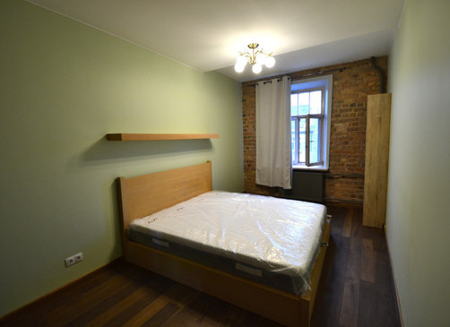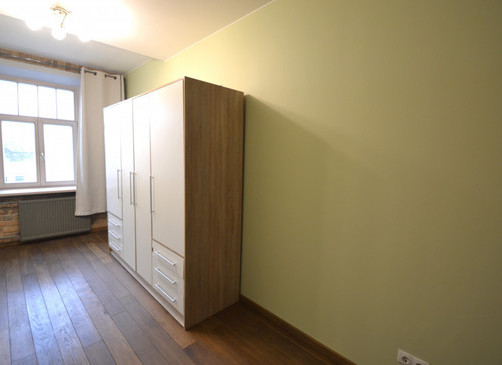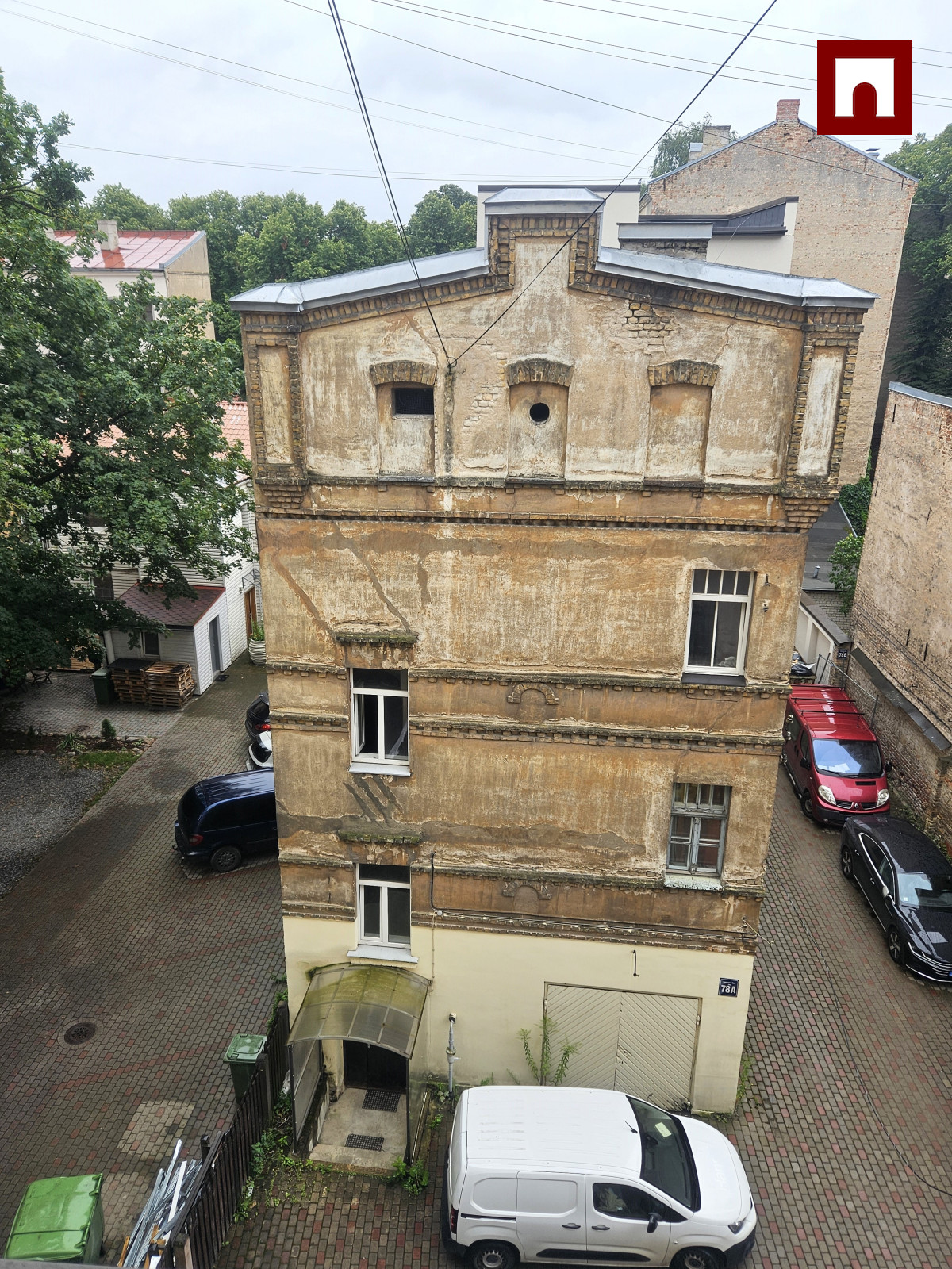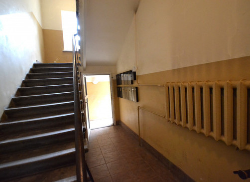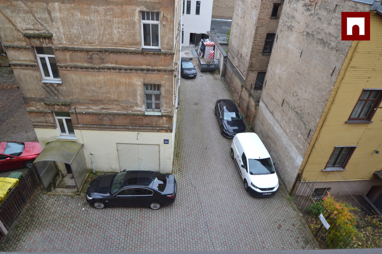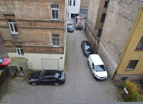 Dzīvoklis atrodas ēkas piektajā stāvā, logi vērsti gan uz pagalma, gan ielas pusēm.