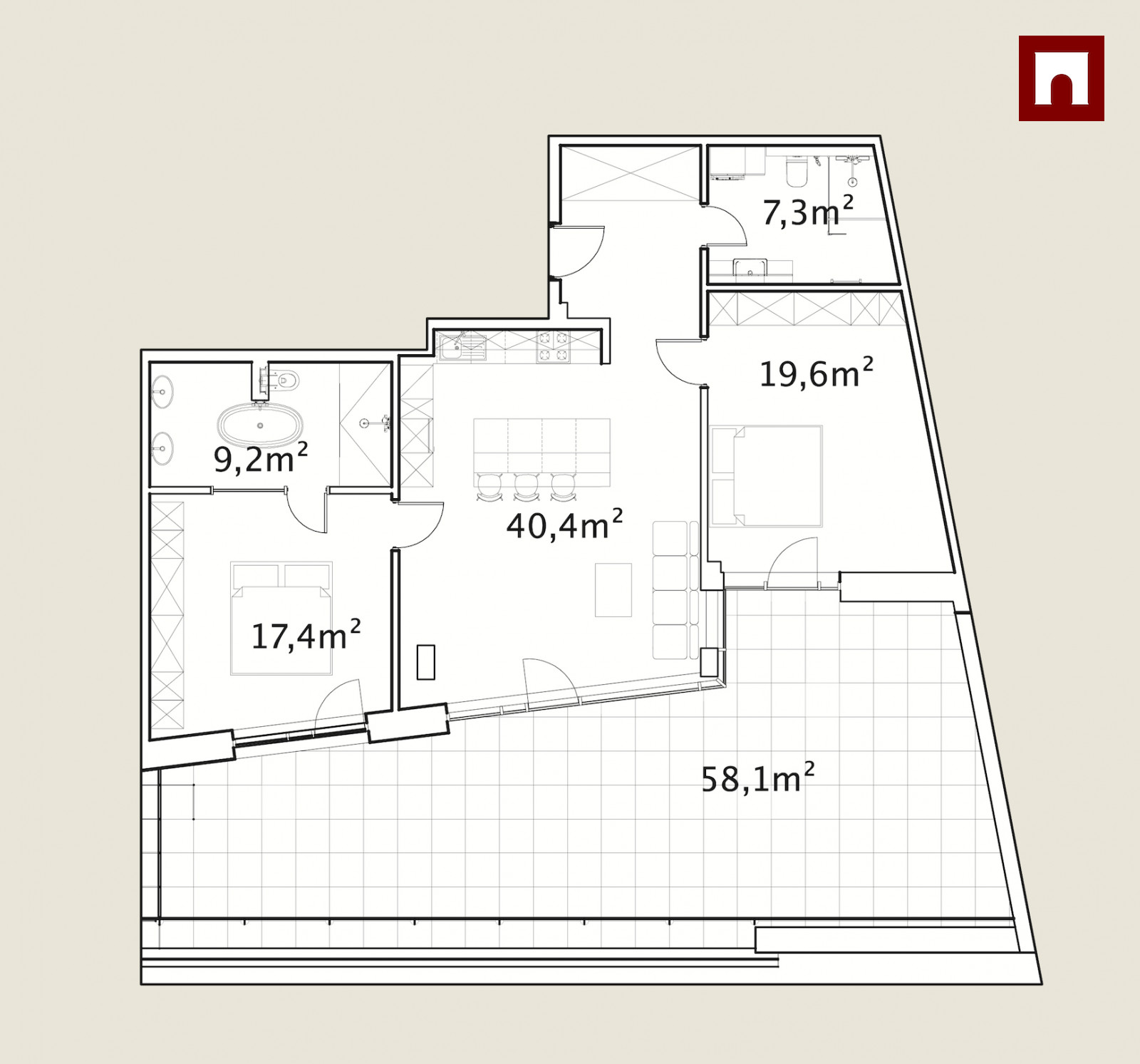 + 3 istabas – plaša viesistaba apvienota ar virtuvi, 2 guļamistabas (viena ar privātu sānmezglu), atsevišķs sānmezgls un plaša un skaista terase