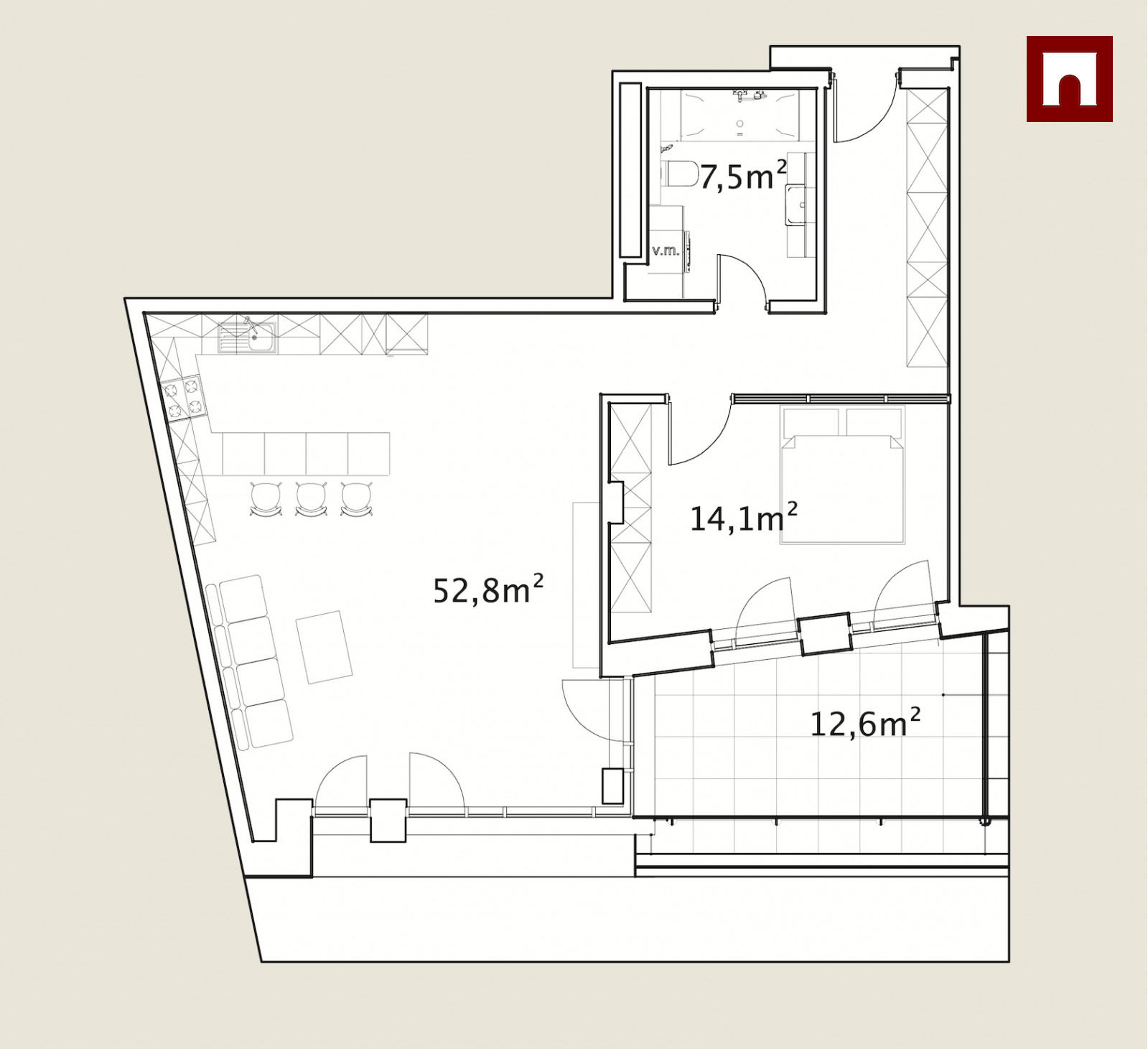 + 2 istabas – plaša viesistaba apvienota ar virtuvi, guļamistaba, atsevišķs sānmezgls un terase