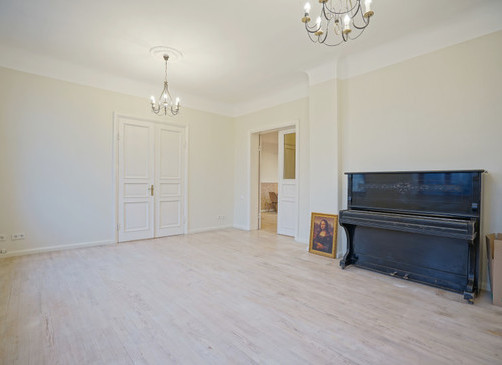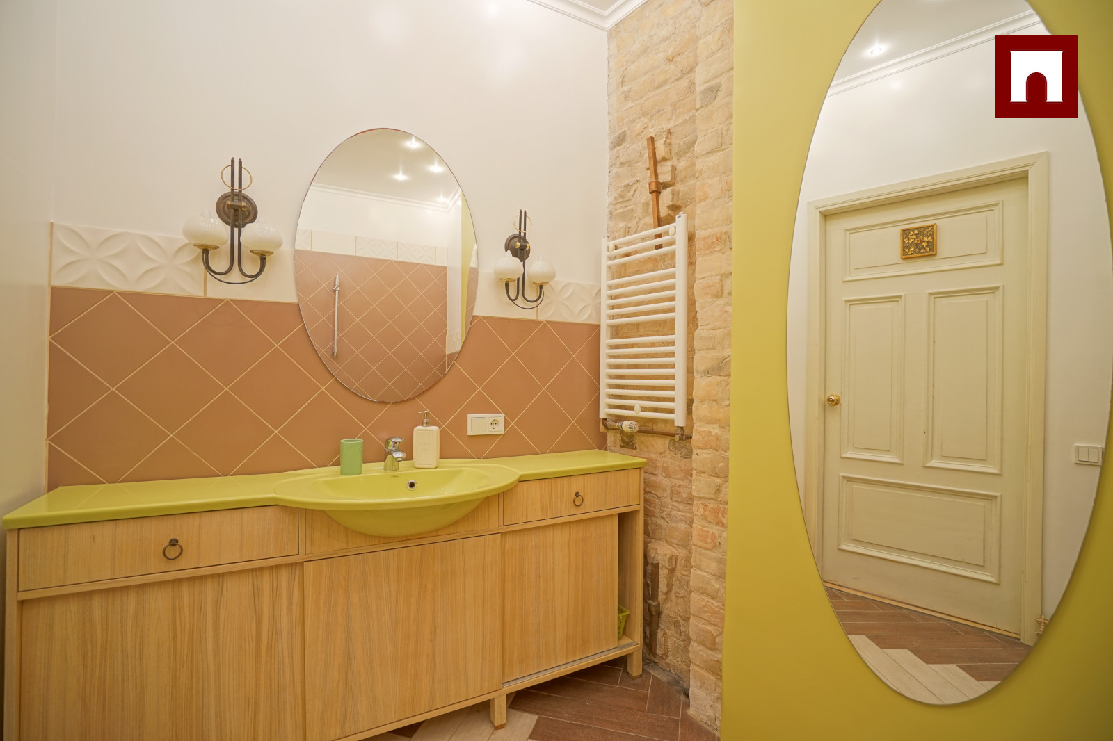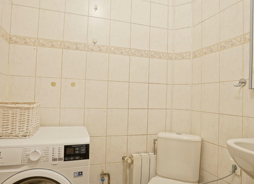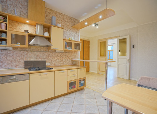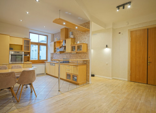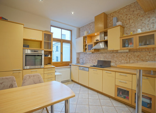 Dzivoklis ir ar augstiem griestiem un salidzinoši plašs, aprīkots ar visu nepieciešamo sadzīves tehniku.