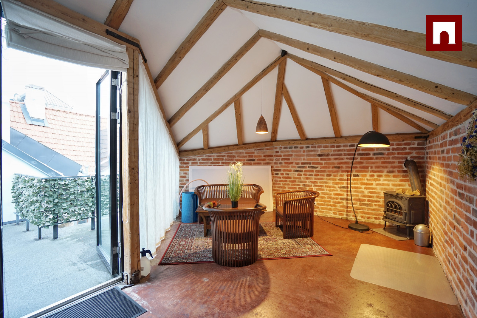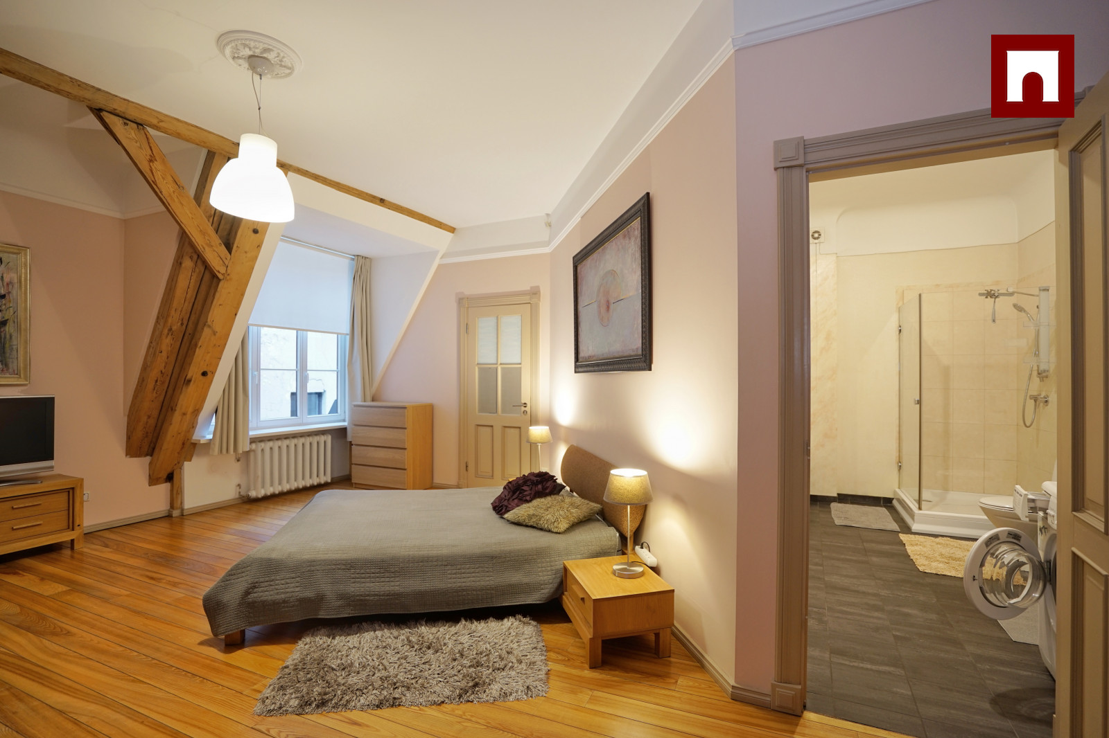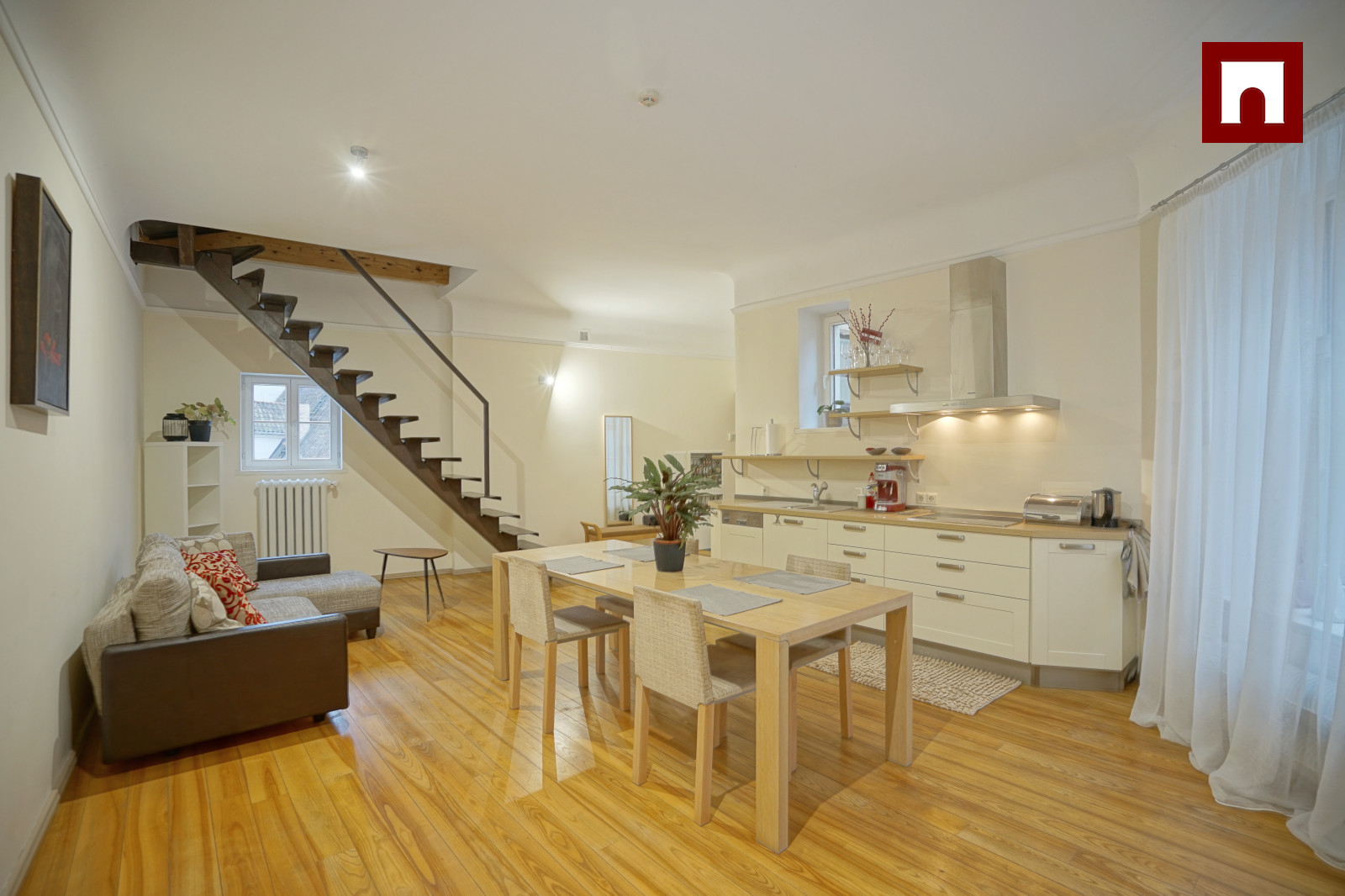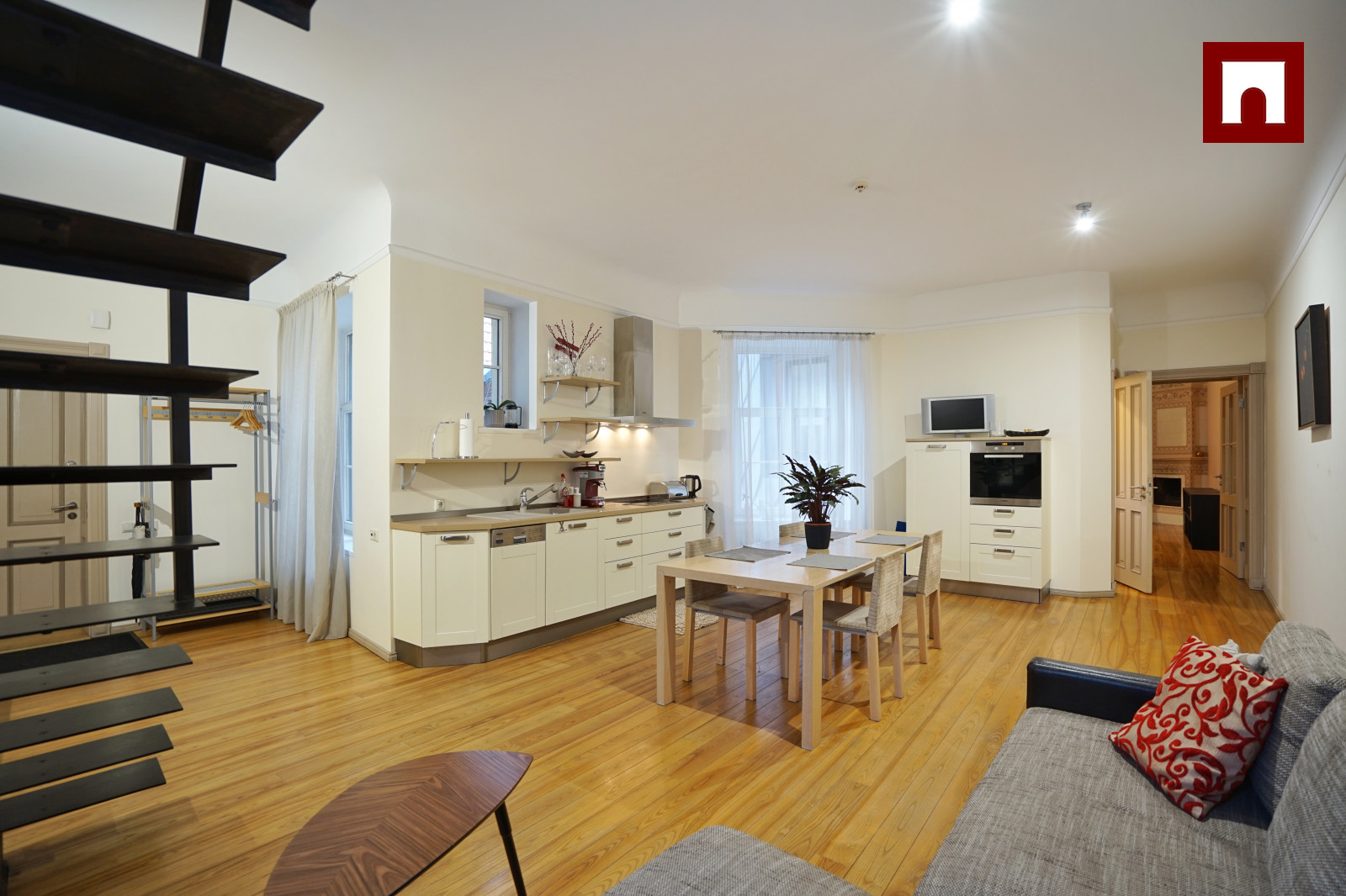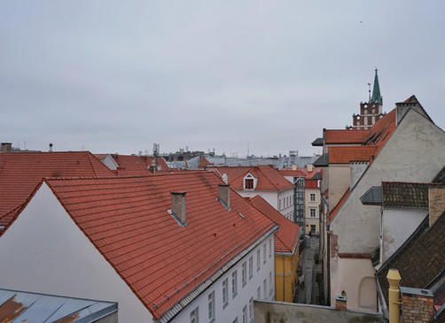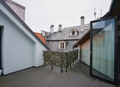 Dzīvoklis piedāvā pārdomātu un komfortablu plānojumu: guļamistaba atrodas pirmajā līmenī, savukārt otrajā līmenī pieejama atpūtas telpa ar izeju uz āra terasi, no kuras paveras burvīgs skats uz Konventa sētu.