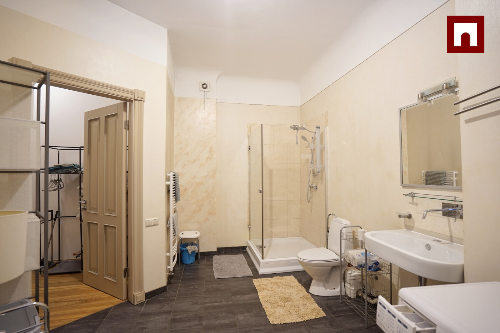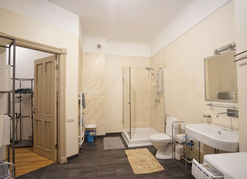 Dzīvoklī ir divas tualetes, no kurām viena apvienota ar dušas telpu un garderobi. Interjerā saglabātas koka parketa grīdas, nodrošināts Wi-Fi un signalizācija.