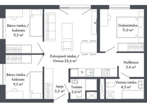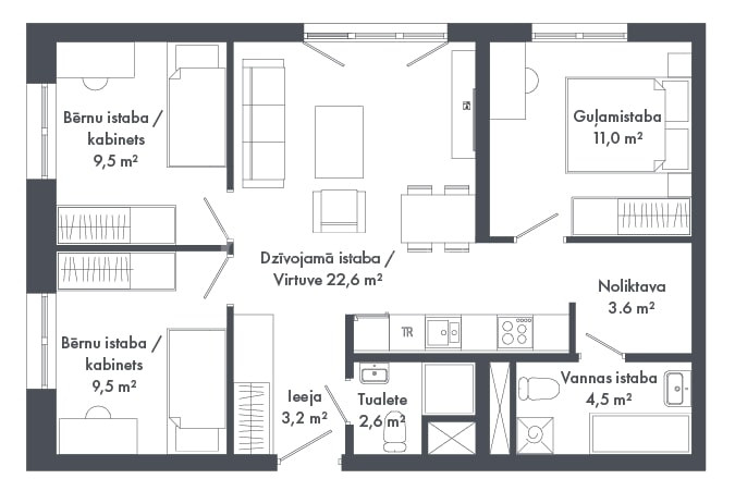 Dzīvoklis ar pilnu iekšējo apdari – 4 istabu dzīvoklis (66.5 m2), izvietots 1.stāvā 6 stāvu mājā.