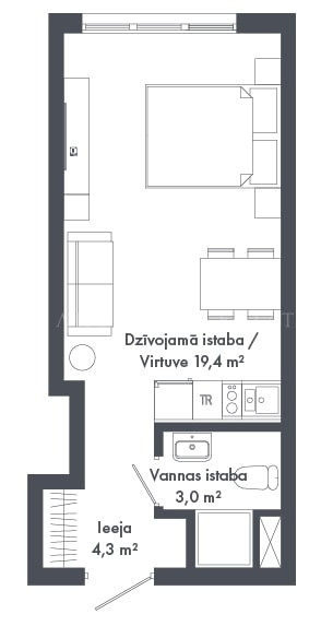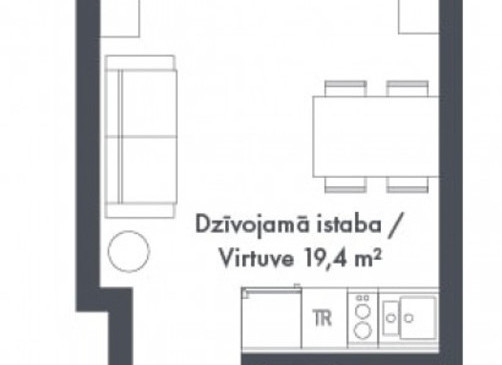 Dzīvoklis ar pilnu iekšējo apdari – 1- istabu dzīvoklis (26,7 m2), izvietots 1.stāvā 6 stāvu mājā.