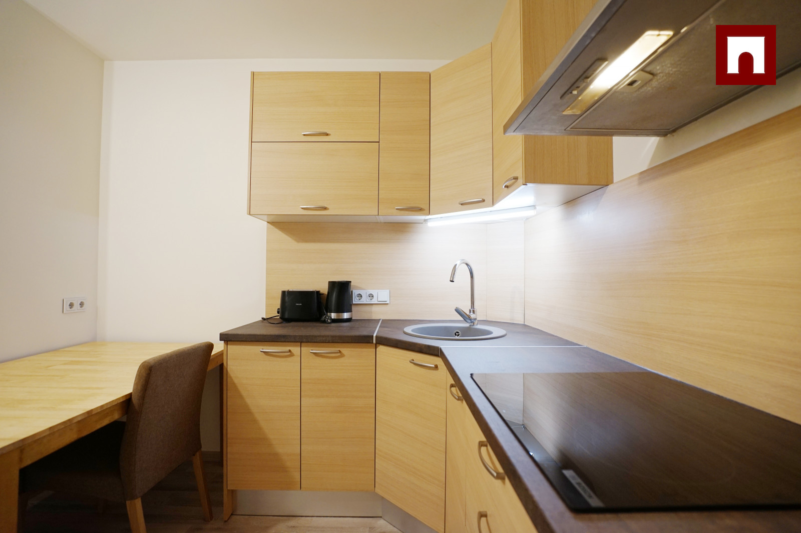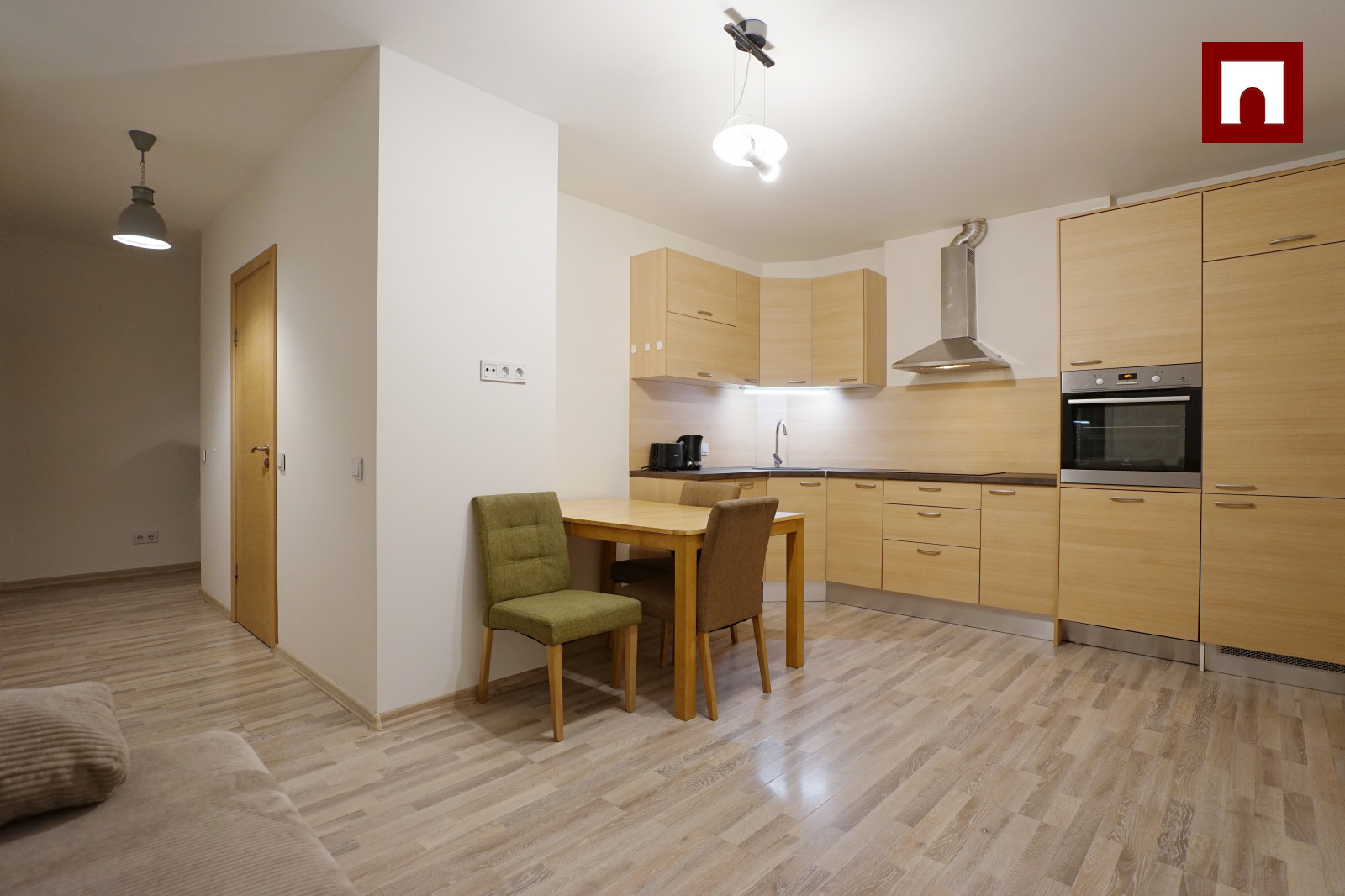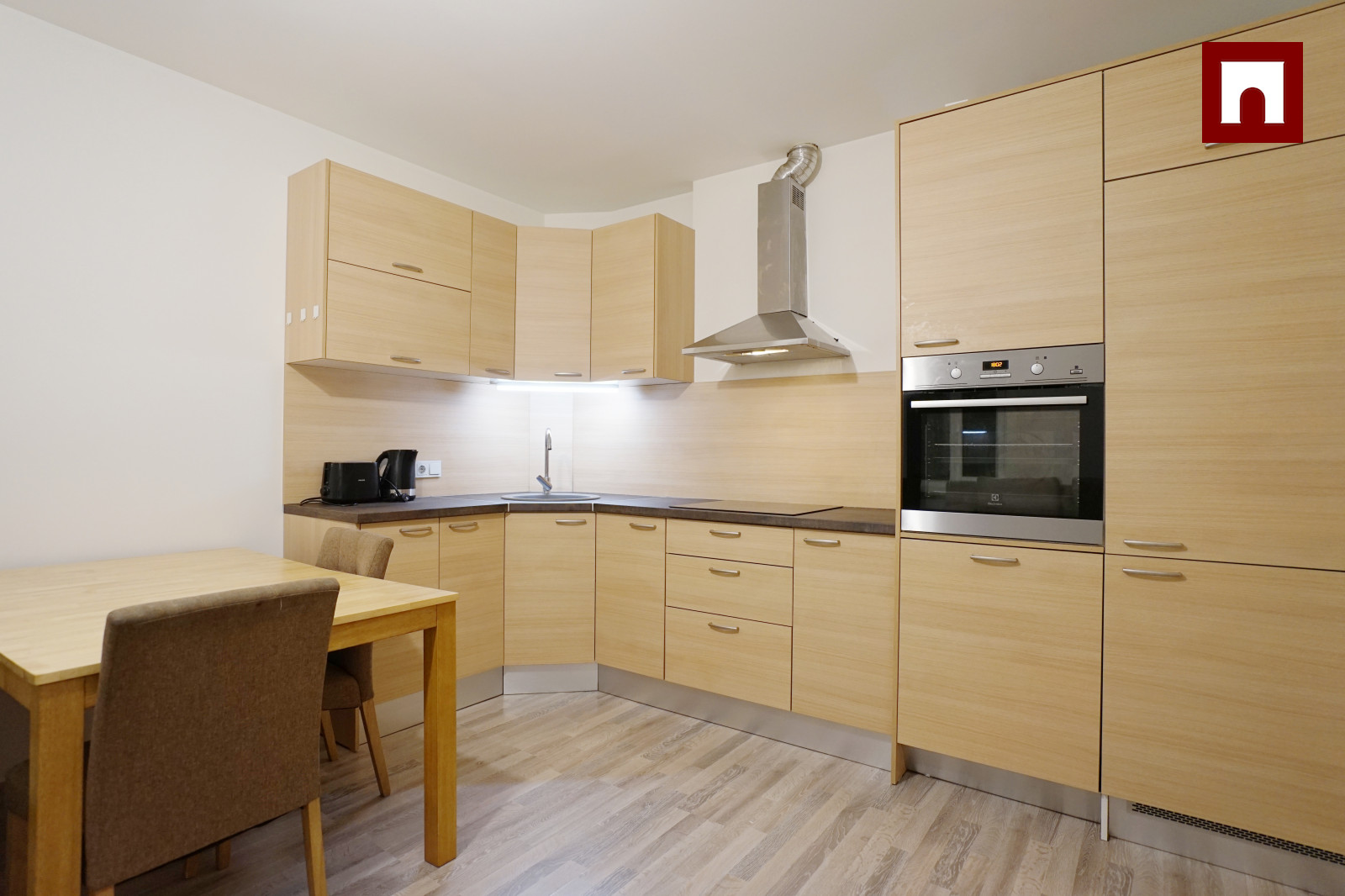 ⁃ Aprīkota virtuve - trauku mašīna, elektriskā plīts, cepeškrāsns, augsts iebūvēts ledusskapis, daudz skapīšu, darba virsma, liels izvelkams pusdienu galds ar mīkstiem krēsliem.