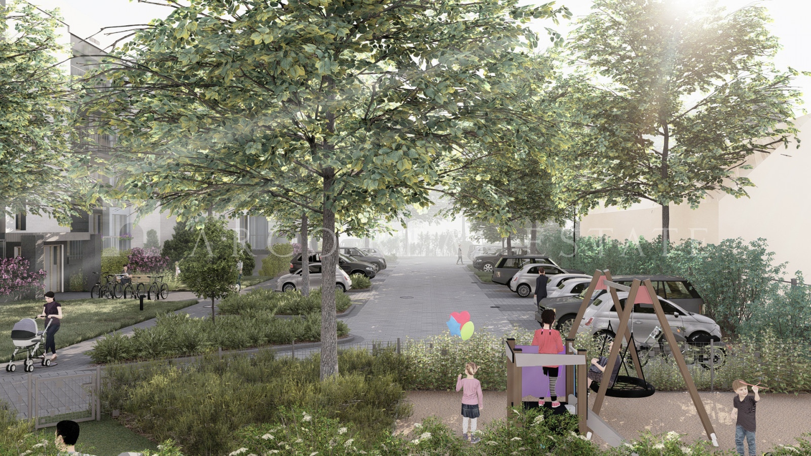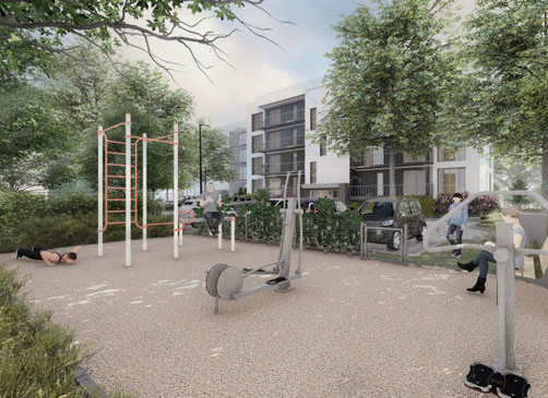 Ap māju ierīkots slēgts, labiekārtots pagalms, kur bērniem spēlēties drošā vidē un pieaugušajiem sportot vai atpūsties.
