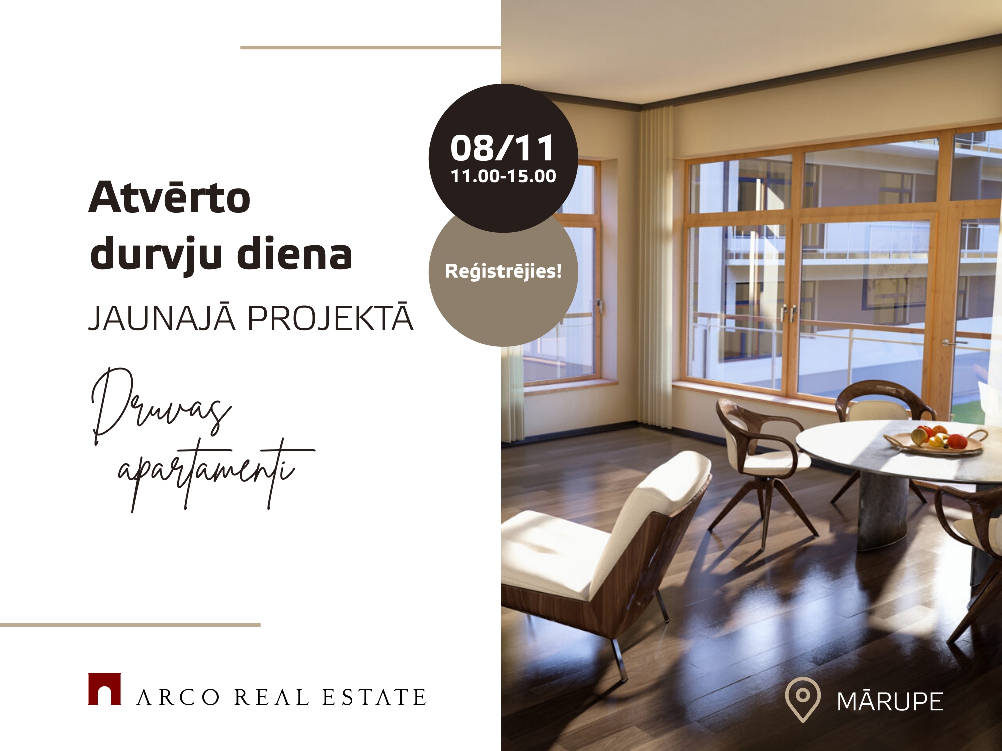 Jaunajā projektā “Druvas apartementi”, kas atrodas Druvas ielā 38, Mārupē, sestdien, 8. novembrī, no pulksten 11.00 līdz 15.00 norisināsies atvērto durvju diena. Lai apmeklētu pasākumu, iepriekš jāreģistrējas, aizpildot zemāk redzamo anketu.