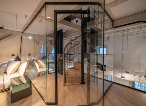 + Spacious studio living room with a natural wood fireplace and views of the roofs of Old Riga and church choirs