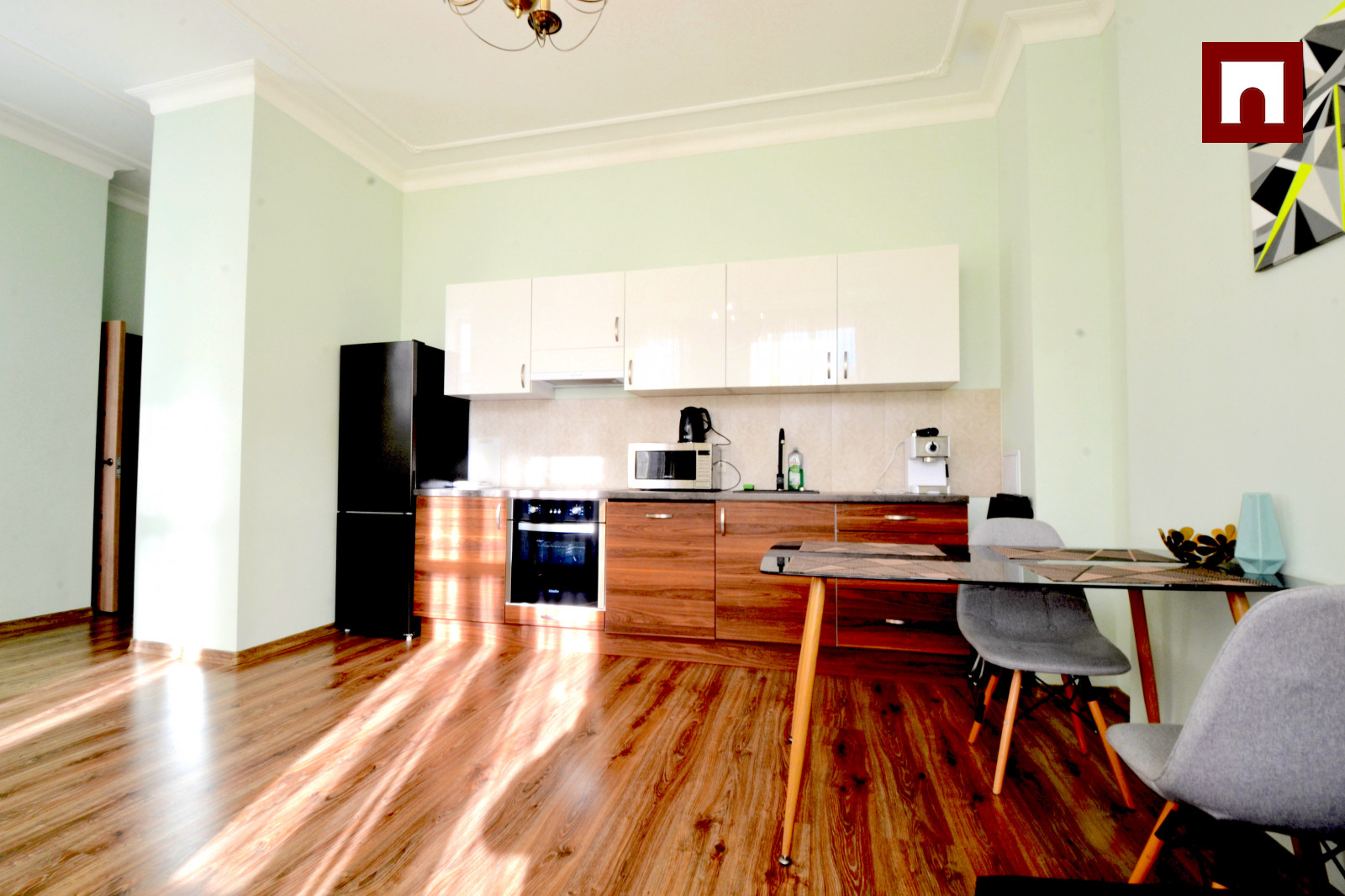 Квартира полностью оборудована всем необходимым для комфортного проживания, включая мебель. Высота потолков – 3,2 метра. Здание имеет высокую энергоэффективность, что обеспечивает низкие коммунальные платежи. В квартире установлены индивидуальные счетчики отопления. Кладовая на первом этаже доступна за дополнительную плату.