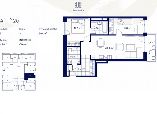 Проект Blue Marine связан с особым очарованием полуострова Кливерсала. Название отражает романтическую атмосферу Средиземноморья — солнечного полуострова, окруженного Агенскалнским заливом, Даугавой и близостью моря. Кроме того, полуостров Кливерсала исторически ассоциировался с мореплавателями и кораблями, а также с торговой логистикой по воде.