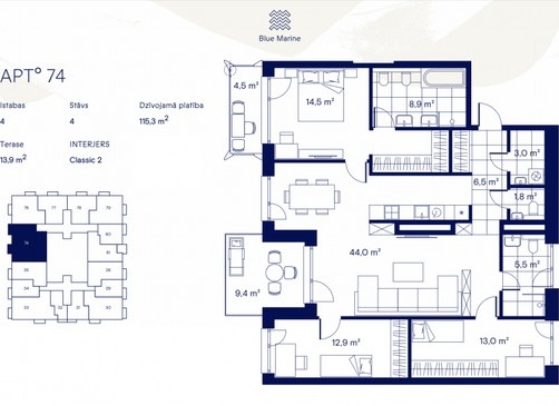 Проект Blue Marine связан с особым очарованием полуострова Кливерсала. Название отражает романтическую атмосферу Средиземноморья — солнечного полуострова, окруженного Агенскалнским заливом, Даугавой и близостью моря. Кроме того, полуостров Кливерсала исторически ассоциировался с мореплавателями и кораблями, а также с торговой логистикой по воде.