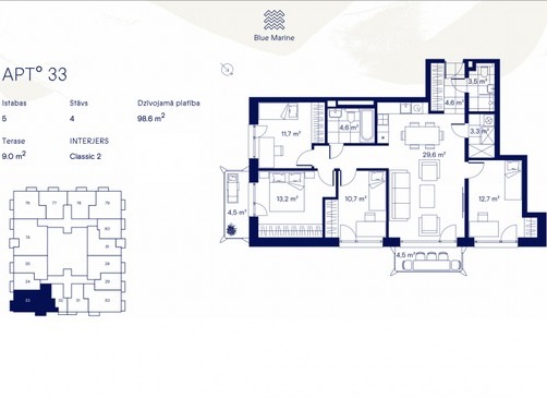 Проект Blue Marine связан с особым очарованием полуострова Кливерсала. Название отражает романтическую атмосферу Средиземноморья — солнечного полуострова, окруженного Агенскалнским заливом, Даугавой и близостью моря. Кроме того, полуостров Кливерсала исторически ассоциировался с мореплавателями и кораблями, а также с торговой логистикой по воде.